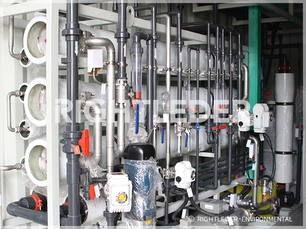 萊特萊德180m³/d反滲透設備從海水取水系統開始先粗過濾、降低海水濁度,然后用專門的高壓增壓泵,海水進入反滲透膜,經過反滲透膜處理的海水,含鹽量大大降低,產水進淡化水箱。